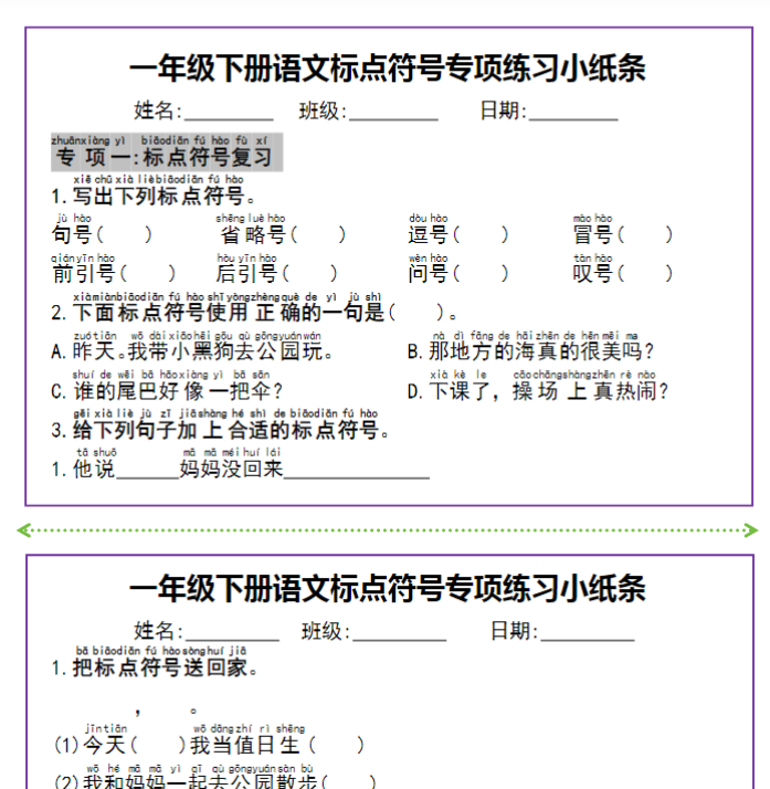 | ✨一键保存高清电子版!标点符号专项练习小纸条,让一年级语文基础一步到位!趣味口诀+实用训练,告别标点错误,家长老师必备神器,限时免费下载! | |