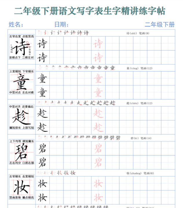 | 一键保存高清版,二下语文写字表生字精讲+练字帖(全250字42页)!拼音笔顺笔画详解,手写示范高清无水印,同步教材每日一练,让孩子书写工整又快又准!速存立即提升作业质量! | |