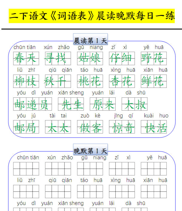 | ☀️二下语文词语表晨读晚默每日一练(15天)→一键快速保存,每日打卡提分超轻松!错过等一年的高效积累工具! | |