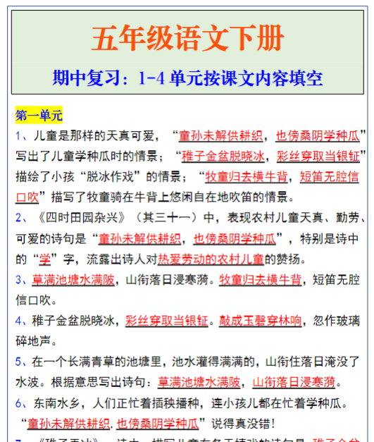 | 【立即一键下载】五年级语文下册期中1-4单元课文内容填空题!精准复习,高效提分! | |