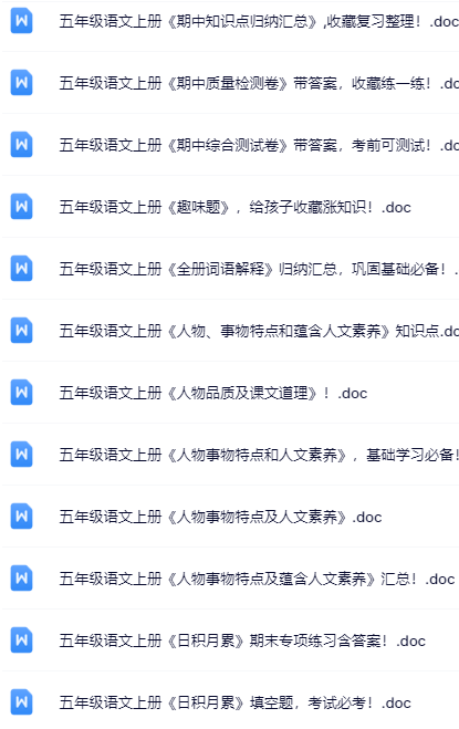 | 资源亮点 |  100套完整无水印精品资料,全为高清原图! 同步五年级上册语文教材,课时精练、单元检测全覆盖! 一键打包下载,无需逐个寻找,极速获取教学全套! 名校名师原创汇编,内容严谨无差错,家长教师安心使用!  |