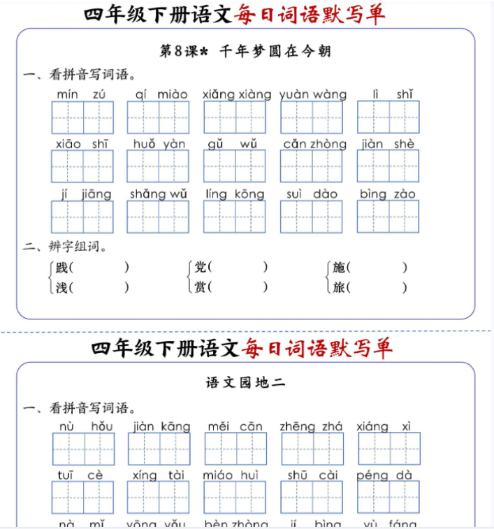| 一键快速保存,20页四下语文每日词语默写单(1-8单元含答案)—小学高频词汇高效练 | |