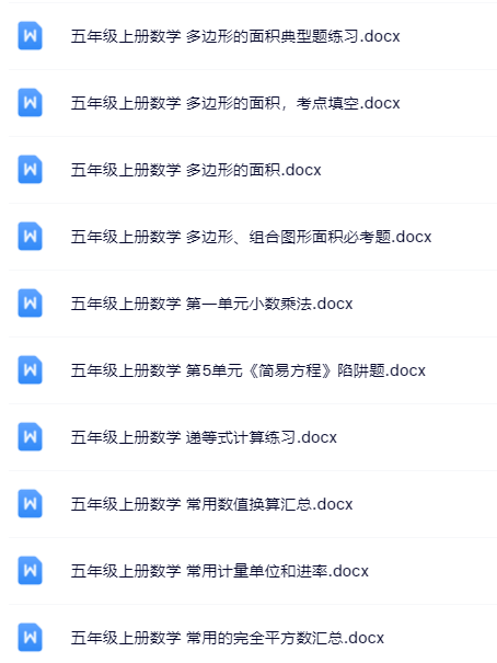 | 内容优势 |  📘小数除法专项训练20套,解法技巧+易错点解析 📘多边形面积思维导图+应用题精讲,打牢几何基础 📘方程与列方程解应用题强化练习,突破重难点思维 📘10份期末总复习密卷(含答案),考前冲刺高效提分  |