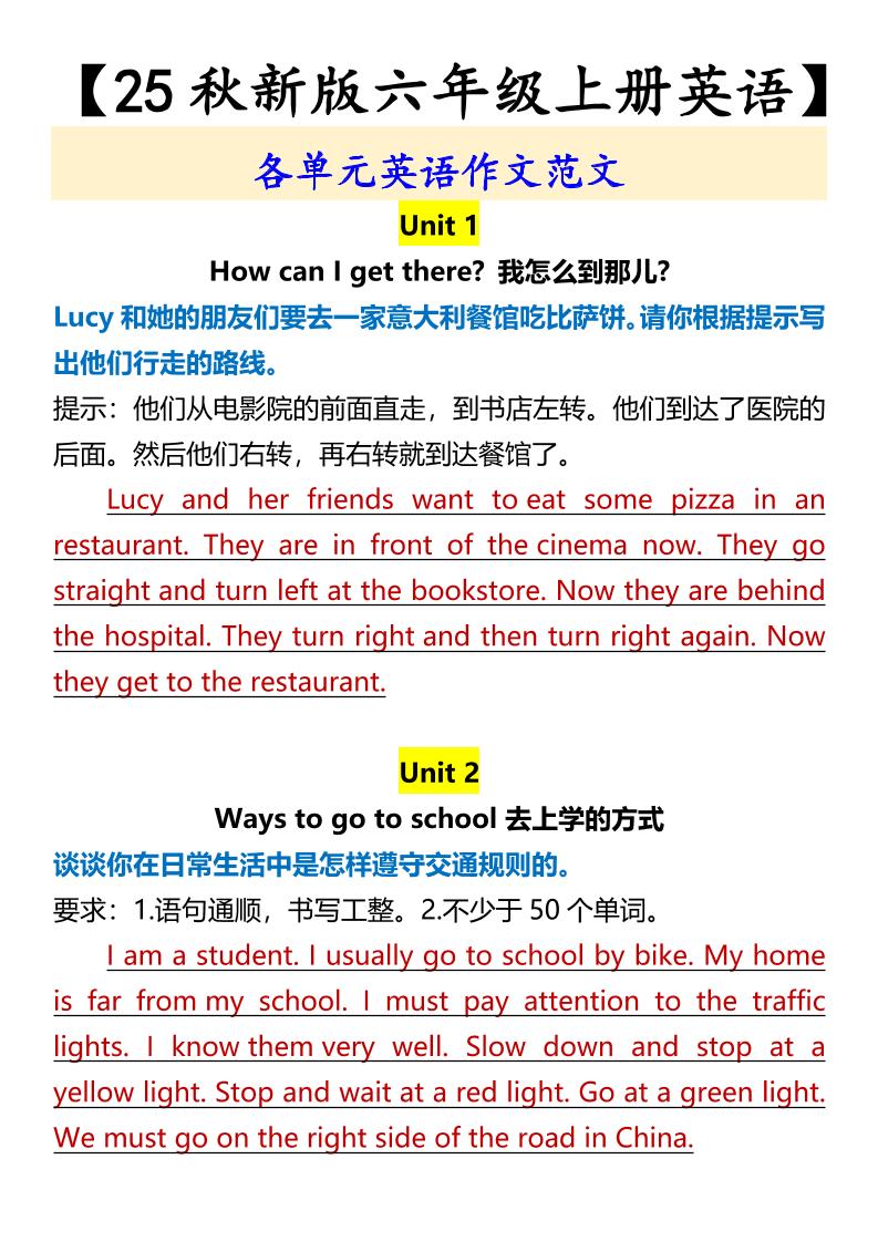 【2025秋新版】【六年级上册英语】各单元英语作文范文 | |