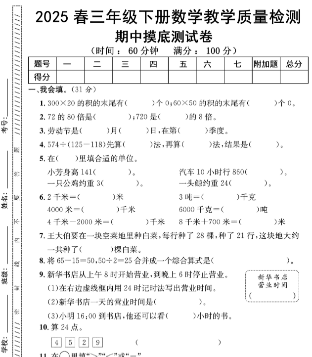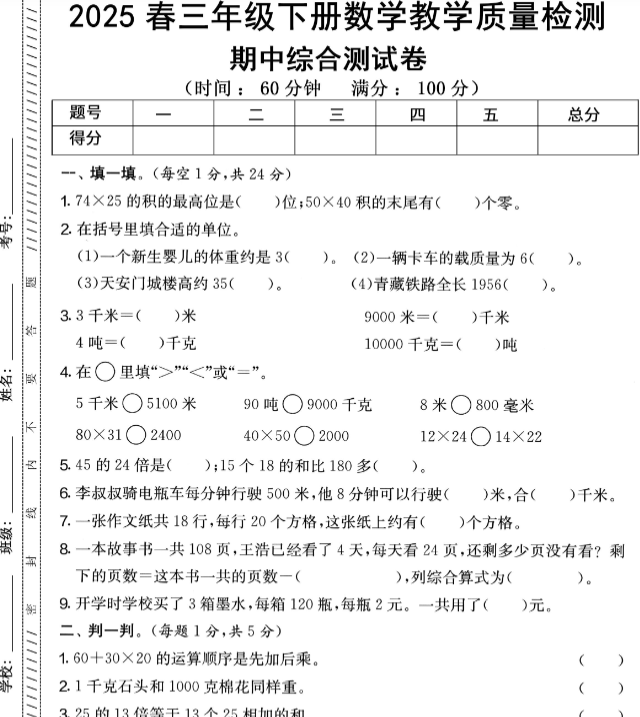 | 内容优势 | 覆盖位置与方向、两位数乘除法、面积单位、分数初步认识等重点模块 每套含填空+选择+操作+应用题,题型全+解析细 名校名师原创命题,难度贴近真题,训练更有效 排版清晰护眼,可直接打印做模拟测试 |