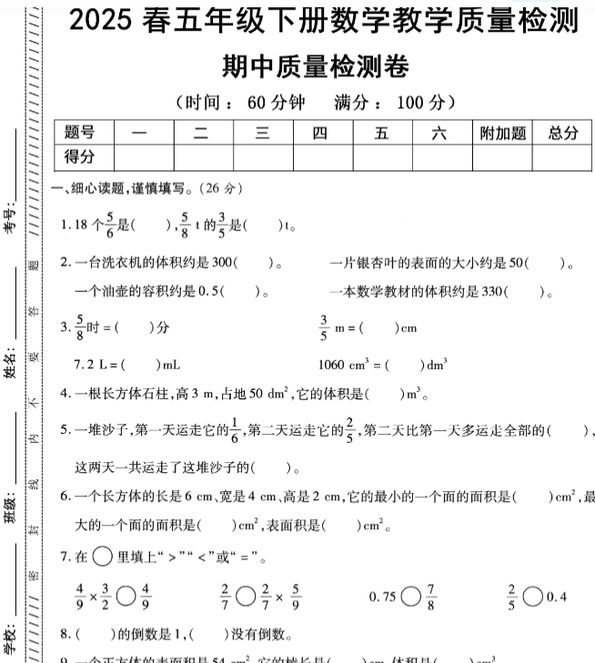 | 内容优势 | 📘 涵盖:分数的加减法、长方体体积、因数与倍数、折线统计图、可能性问题等核心考点 🎯 配套:每套含答题卡+详细解析,步骤规范、易懂 ⏰ 适合:随堂检测|家庭作业|考前模拟|家长辅导 💡 价值:5分钟快速下载,1键保存到电脑/手机,离线随时刷题! |