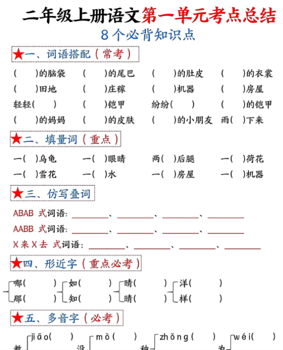 | 【空白版】二上语文1-4单元考点总结(可打印版) | |