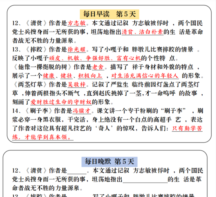 | 资源亮点 | ✅部编版五年级下册语文全9页核心必背内容 ✅按“早读+晚默”科学设计,📚每日仅需30分钟 ✅重点词语+古诗+日积月累一网打尽 ✅带详细注释与记忆口诀,🔥背诵效率翻倍 |