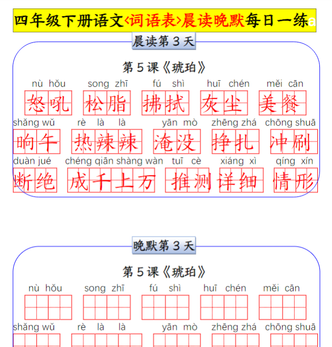 | 18页寒假预习计划 – 四年级下册语文词语+晨读晚默小纸条+每日一练(可打印) | |