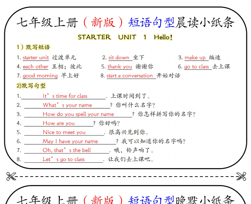 | 26页!七年级上册(新版)短语句型晨读小纸条【完整版】 | |