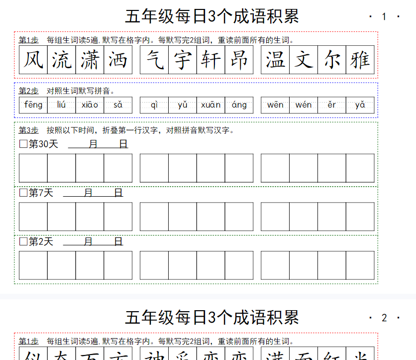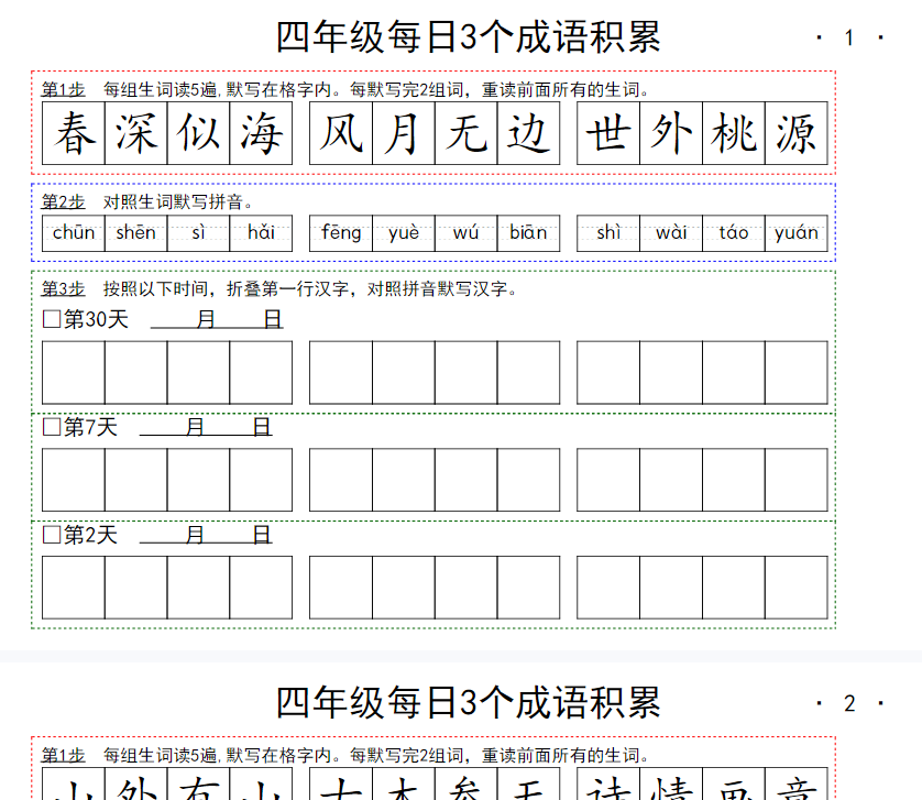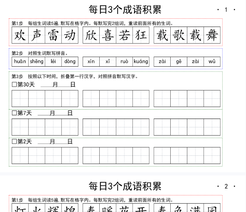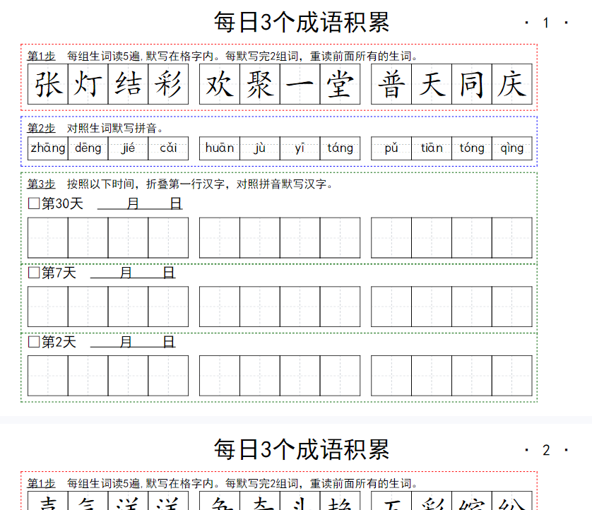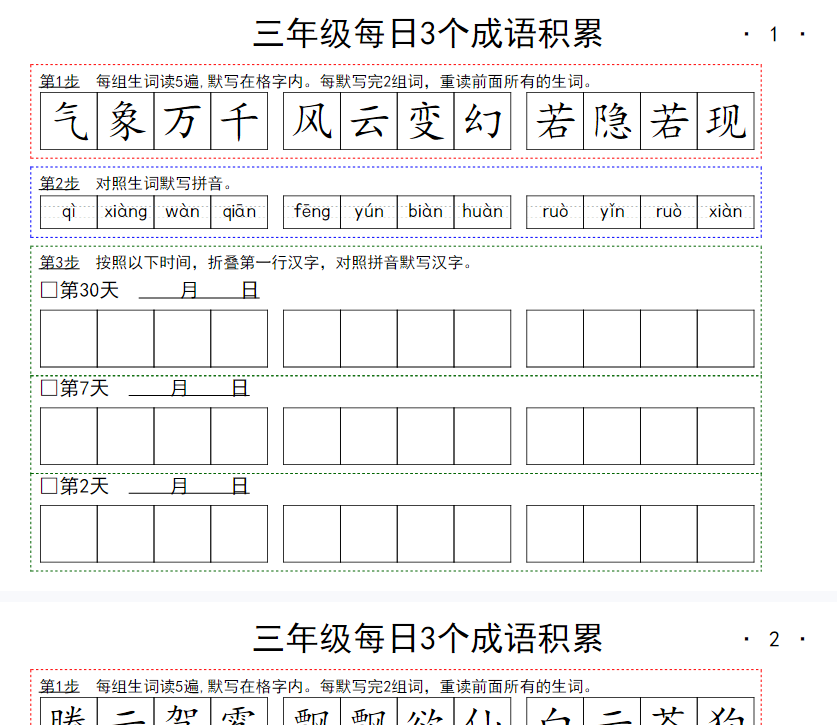 | 资源亮点 | ✅ 全网独家【每日一练】打卡体系 ✅ 覆盖1-6年级课标要求成语1200+ ✅ 每词配图+例句+近反义词 ✅ 支持横屏/竖屏两种下载格式 ✅ 可一键保存至微信/电脑随时学 |