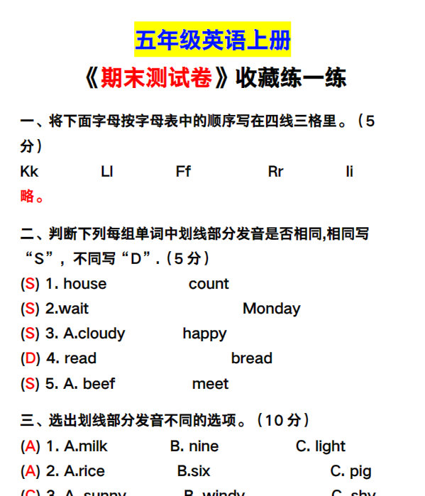 | 26份!最新五年级上册英语期末精品试卷资料打包下载【高清无水印+可编辑】 | |
