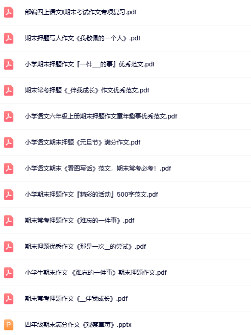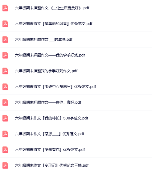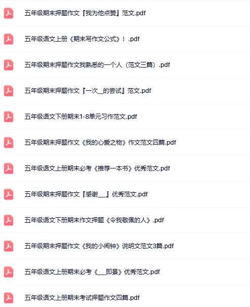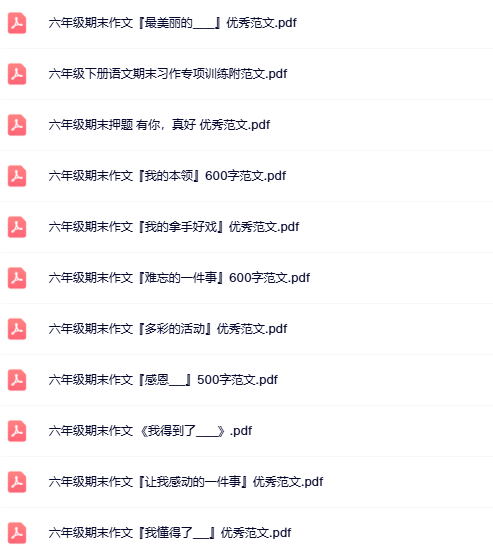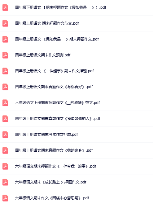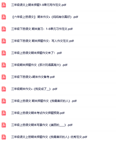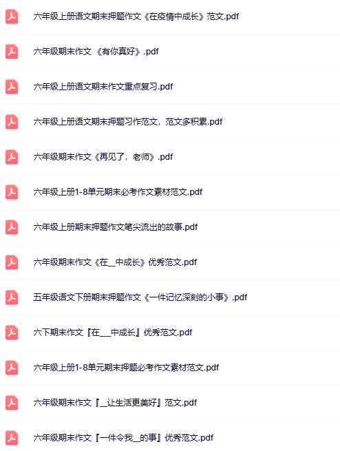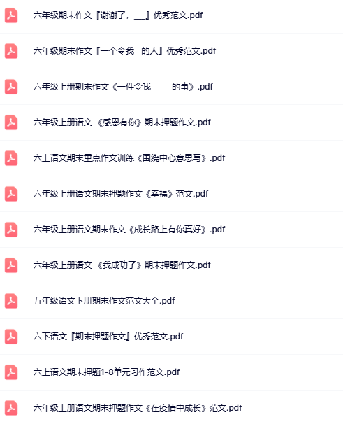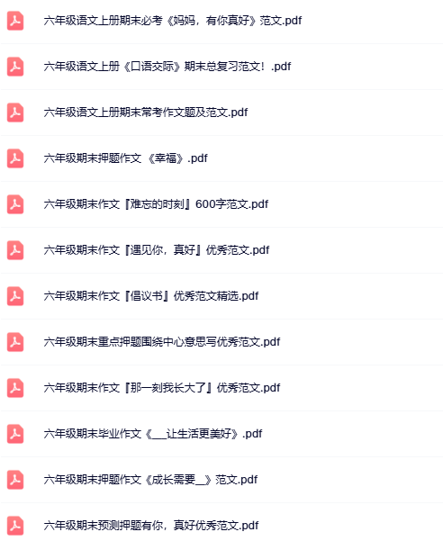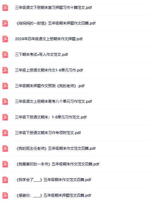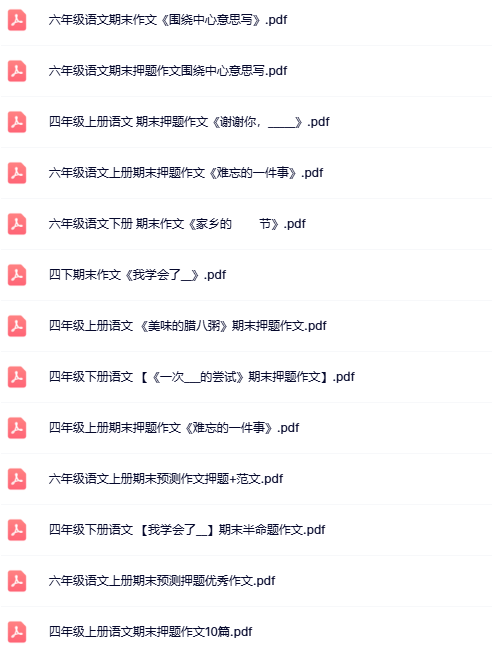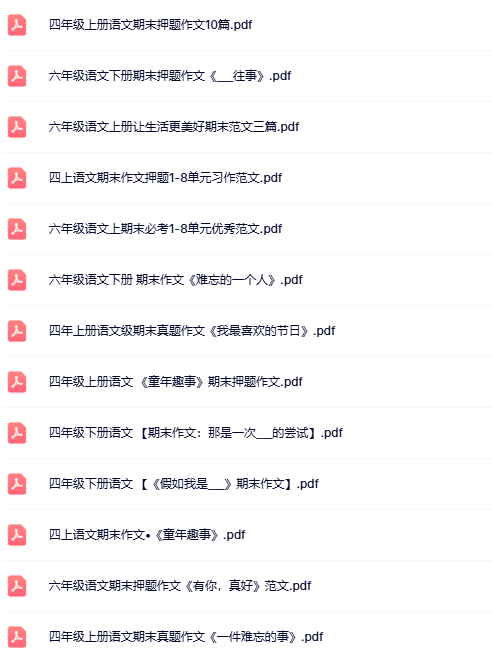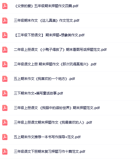 | 资源亮点 | ✅397份独家精编期末作文范文,涵盖常考主题与热点素材! ✅高清无水印完整版PDF,可一键保存为永久学习资料! ✅持续更新中,抢先锁定新增优质内容,永不过时! ✅按年级、主题、文体分类清晰,查找写作灵感零延迟! |