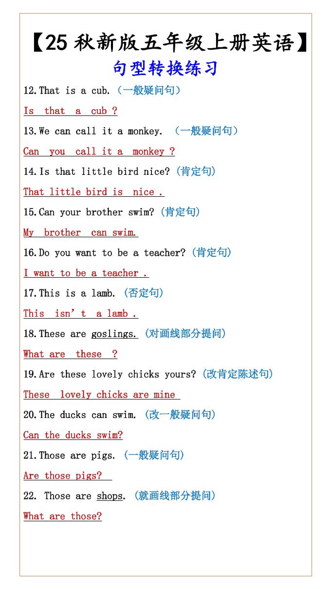 资源亮点 | ✅ 精准匹配五年级上册教材,覆盖全册重点句型无遗漏! ✅ 2025秋新版升级,新增易错点标注+转换技巧口诀,Low access更轻松! ✅ 配套详细解析&答案,练习 neighborhoods 闭环学习,错题不复现! ✅ 无门槛一键下载,手机/电脑/平板随时学,家长辅导超省心! |