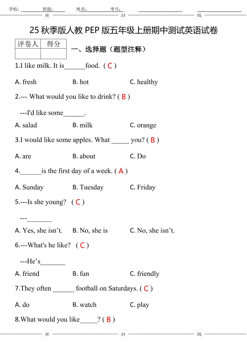 【2025秋新版】人教PEP版五年级上册期中测试英语试卷(可下载) | |