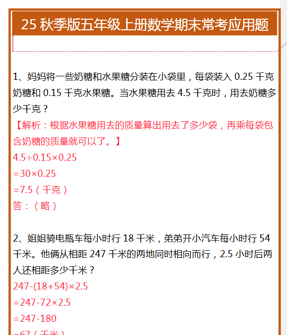 【2025秋新版】五年级上册数学期末常考应用题(完整电子版)