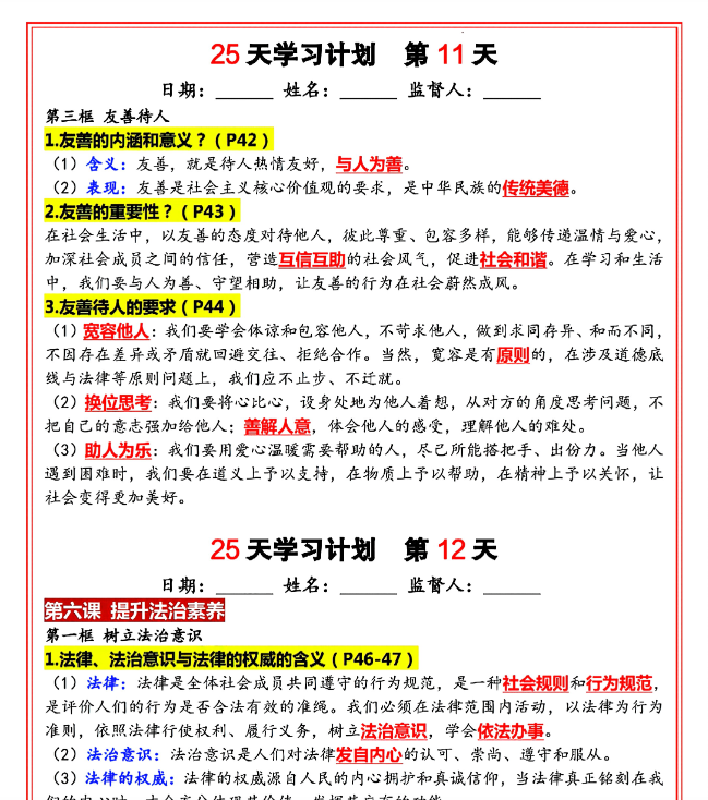| 新版八年级上册道法(人教版)25天学习计划(答案版) | |