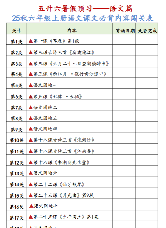 | 一键极速保存!2025秋小学语文《背诵闯关表》1-6年级上册全套电子版,免费领取速存!覆盖全年级必背古诗词+课文段落,考试高分轻松拿下,错过再等一年!立即点击一键保存,抢占背诵提分神器! | |
