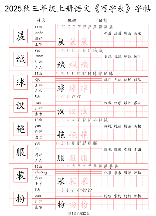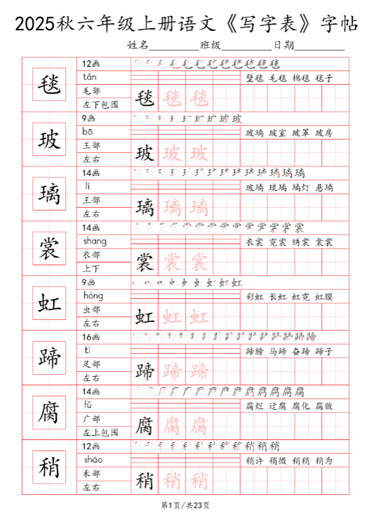 无水印版 - 2025秋1-6年级《写字表》一类字字帖