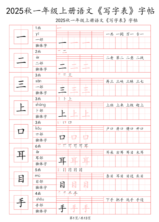 2025秋1-6年级《写字表》一类字字帖-教学网