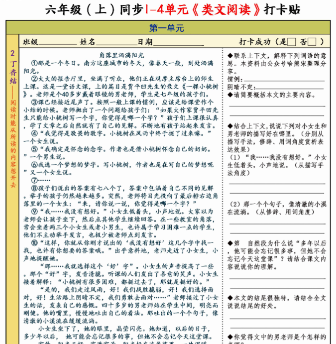 无水印版 - 2025秋类文阅读小纸条【1-6年级最新版】