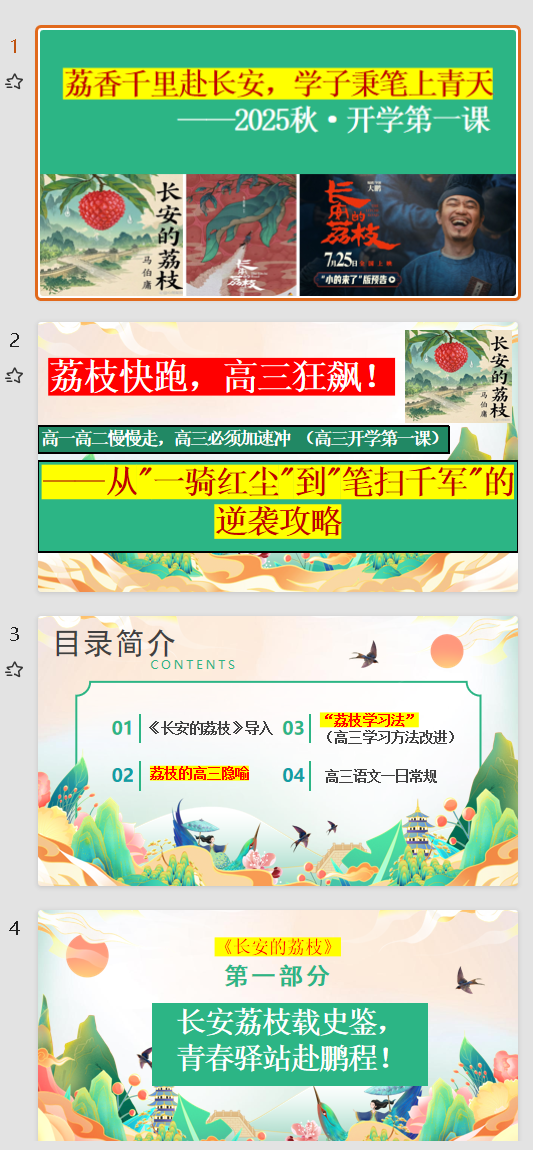 | 内容优势 | 深度解读马伯庸原著《长安的荔枝》文学价值 教学课件结构:背景导入 + 主题解析 + 意象剖析 + 课后任务 视觉设计:唐代色彩搭配 + 长安城插画 + 动画过渡效果 配套视频链接与拓展阅读推荐,打造沉浸式开学课堂! |
