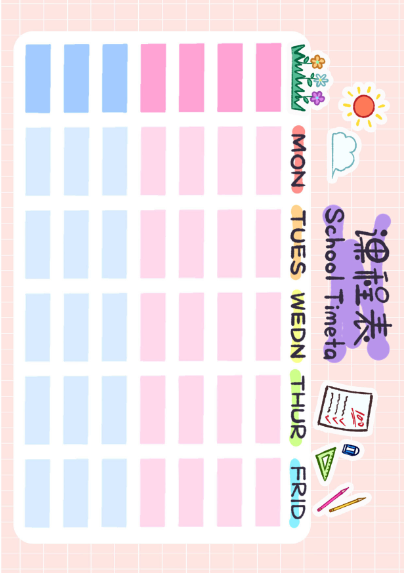 | 使用场景 | 📚学生日常课表规划 📒手账时间管理贴纸 🎨教师课堂可视化教学辅助 📅自习室/图书馆学习打卡工具 |