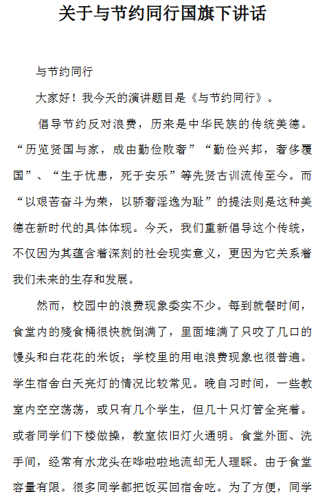 | 核心优势 | 🌟 教育局最新指导精神同步更新 📚 语言精炼生动,适合学生演讲 🎯 结构清晰:开场白+正文+结尾+呼吁行动 💡 内置节约口号金句与数据案例,提升感染力 |
