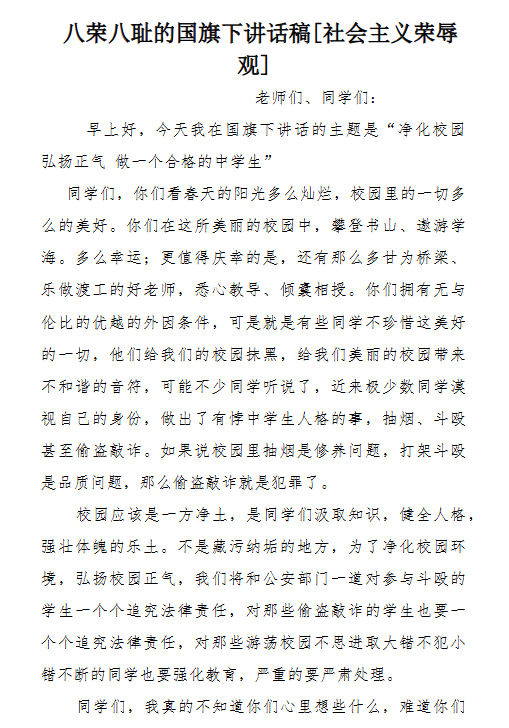 | 一键快速保存!5份荣辱观国旗下讲话最新高清可编辑打包版,直接下载定制教学方案,权威内容即刻使用,错过再无!立即获取演讲资源,助力校园德育高效开展! | |