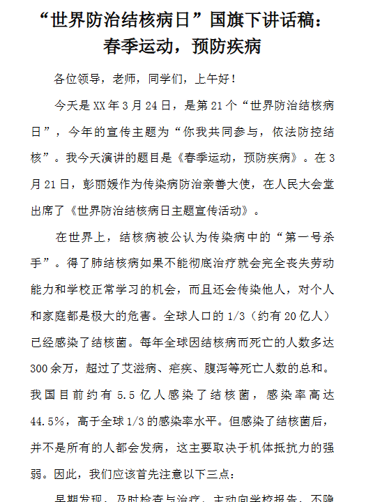 | 【立即一键保存】2024最新防治结核国旗下讲话模板!高清可编辑,下载即用,守护校园健康从这份演讲开始! | |