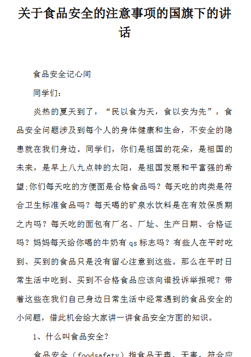 | 一键快速保存高清可编辑国旗下讲话食品安全完整版PPT+Word文档!最新整理权威内容,即刻下载打造完美升旗仪式演讲,错过再无!立即点击获取专属教育素材! | |