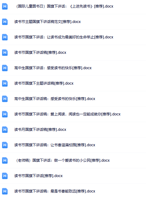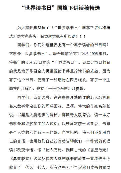 | 40份读书日国旗下讲话最新整理版一键打包下载!高清可编辑Word/PDF模板,秒速获取优质发言稿资源,助你轻松打造精彩升旗仪式演讲,限时免费下载,立即点亮校园文化风采! | |