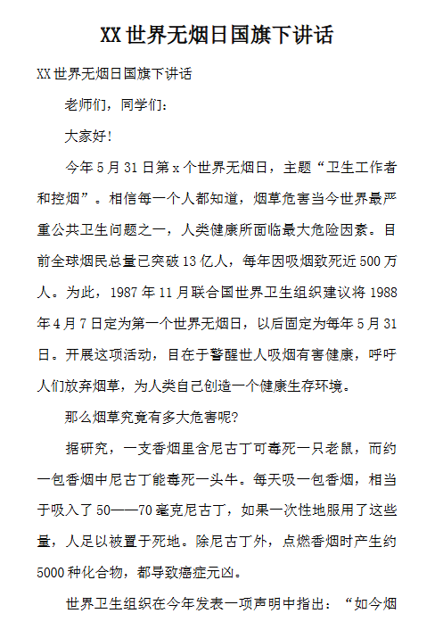 | 内容优势 | 🔥 紧扣世界无烟日主题,呼应健康中国政策 💡 包含开场白、主体内容、总结升华全结构 🎯 适合中小学校长/教师/学生代表多角色使用 ⏰ 每份均标注最新修订时间,确保时效性 |