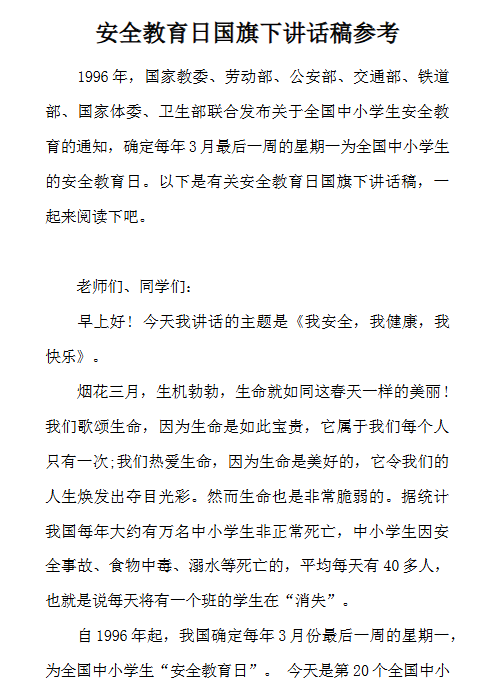 | 内容优势 | 📘 主题明确:聚焦“安全教育日”,立意深刻、富有感染力 🎯 适用性强:可直接用于晨会、升旗仪式、主题班会等场景 ✍️ 结构清晰:含标题、正文、开场白、结尾升华,逻辑严谨 📚 语言规范:标准书面语与口语结合,适合学生朗读与教师演讲 |
