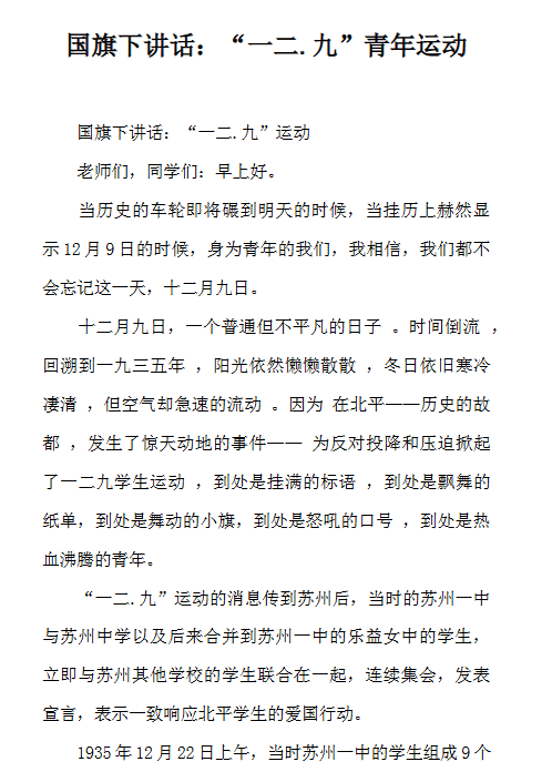 | 一键快速保存,5份一二九运动国旗下讲话最新整理版【高清可编辑打包】——权威内容、即点即存,助力校园演讲一键获取,错过再无!立即下载高清完整版! | |