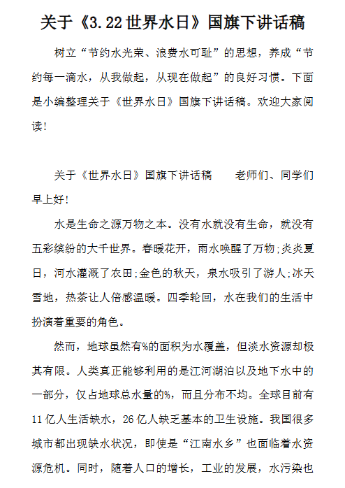 | 适用场景 | 🏫 小学、中学升旗仪式演讲 🌐 环保主题班会/社团活动发言 📢 校级“世界水日”主题升旗演讲比赛 📄 教师备课素材、学生社会实践报告参考 |