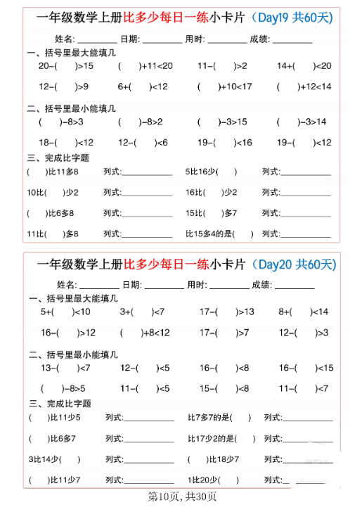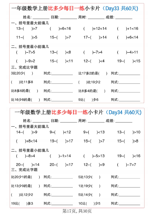 一键快速保存!2025秋一年级数学上册《比多少》每日一练小卡片(60天完整版,30页高清打印)✅ 每日5分钟,幼小衔接轻松进阶!数字对比、数量匹配专项训练,让孩子秒懂大小多少,数学思维一步到位,限时免费下载打印,拿走即用!