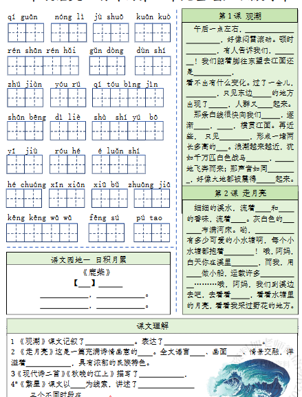 | 内容优势 | 📘生字词组记忆卡:图解+组词+造句,牢固掌握 📖课文理解精讲:重难点解析+中心思想提炼,提升理解力 ✍️作文提分模板:经典素材+开头结尾模板,4周写出优秀作文 🧠阅读理解技巧:3大题型+答题公式模板,考试不丢分 🎯古诗日积月累:注释+诗意拓展+背诵表,积累更轻松 |