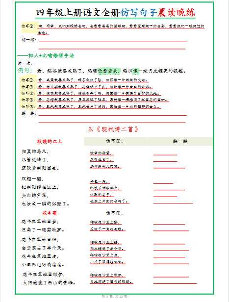 | 新四年级上册语文全册句子仿写晨读晚练(23页)📚✅ 一键保存高清PDF,晨读晚练每日打卡,让语言表达步步为赢!限时免费极速下载,抢先为孩子打造语文写作黄金模板! | |