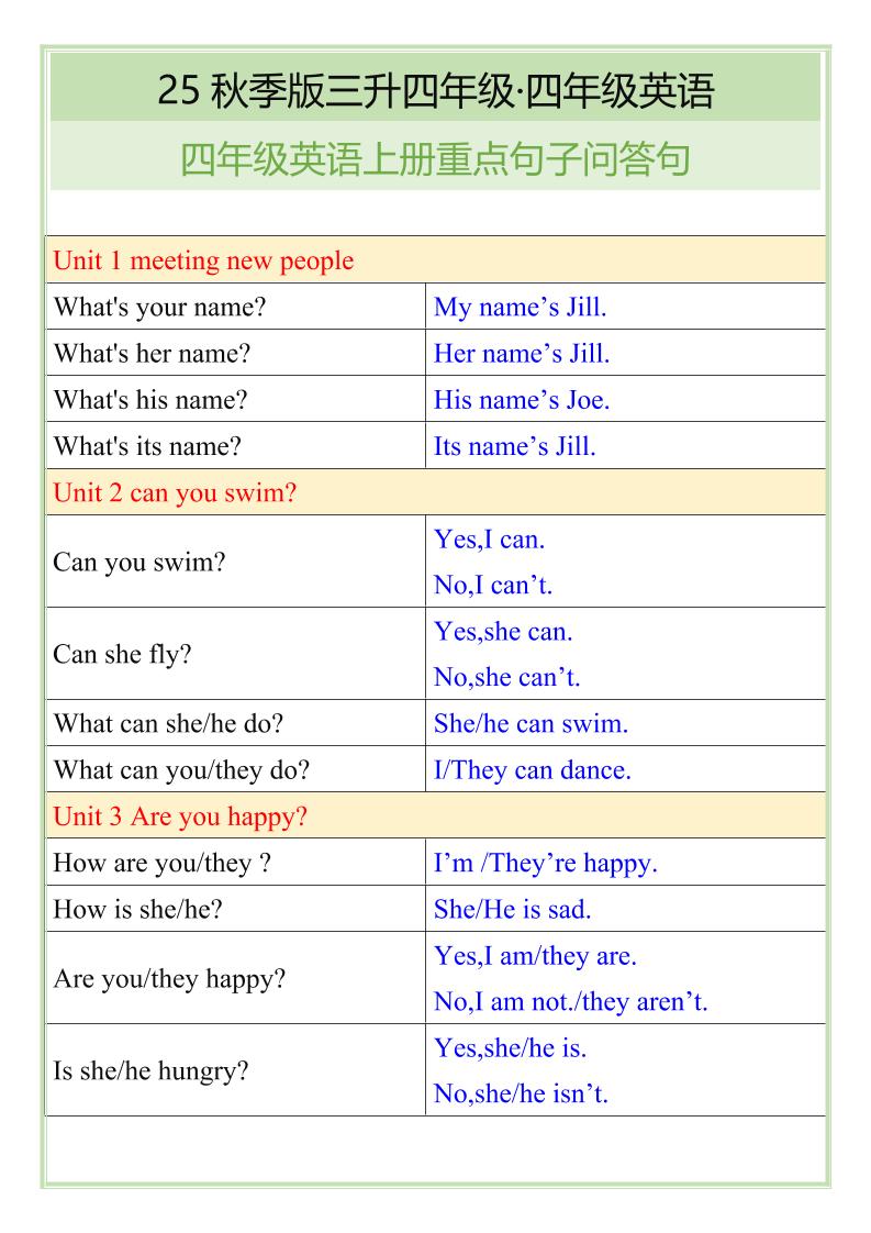 🔥【2025秋新版】四年级英语上册重点句子问答句 – 一键快速保存,边学边测秒提升!海量优质句型模板随时下载,掌握考试高分技巧超简单,学习效率翻倍不是梦!立即点击获取2025秋更新版资源! | |