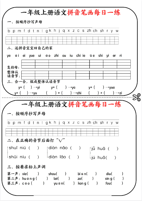 一年级上册语文《拼音笔画每日一练》完整高清练习册 – 一键下载,立即打印开练!