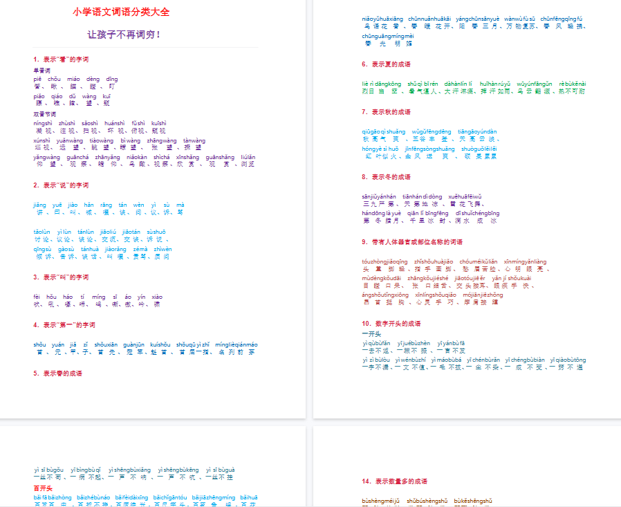 | ✨一键保存高清打印版!29页词语分类大全带拼音📚,分类科学、标注清晰,作文背诵、考试速查神器,家长教师速藏备用!点击立即下载,打造孩子的语文词汇王冠! | |