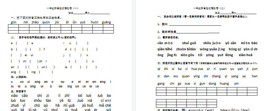 | 高清一键下载,立即打印!2页完整版拼音学习验收模拟卷,精准检测拼音掌握水平,老师家长首选辅导资料,让孩子轻松闯关拼音关!限时免费获取! | |
