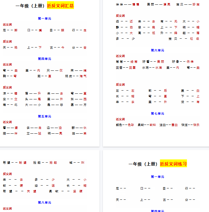 | 【6页完整版】一上近反义词汇总+练习【期末高清版可直接打印】 | |