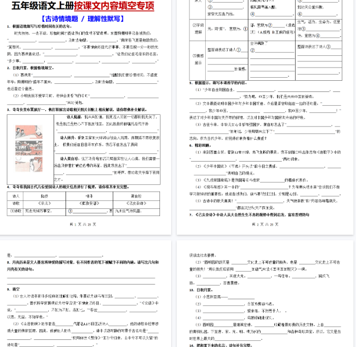 | 资源亮点 | ✅ 精准对应语文5-8单元课后生字、词语、课文理解与古诗默写 ✅ 23页全彩高清PDF格式,排版清晰美观,支持直接打印! ✅ 重点难点全覆盖,标注易错字与高频考点,默写不再丢分! ✅ 名校教师原创设计,同步课堂进度,期末冲刺神器! |