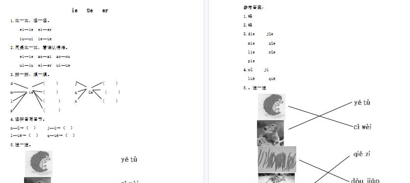 | 内容优势 | 🔹ie üe er 发音对比详解,击破易混淆难点 🔹拼音组词+拼读练习,强化实际应用能力 🔹配套书写描红模板,规范书写笔顺 🔹课后巩固小测验,检测学习成效,巩固知识扎实度 |
