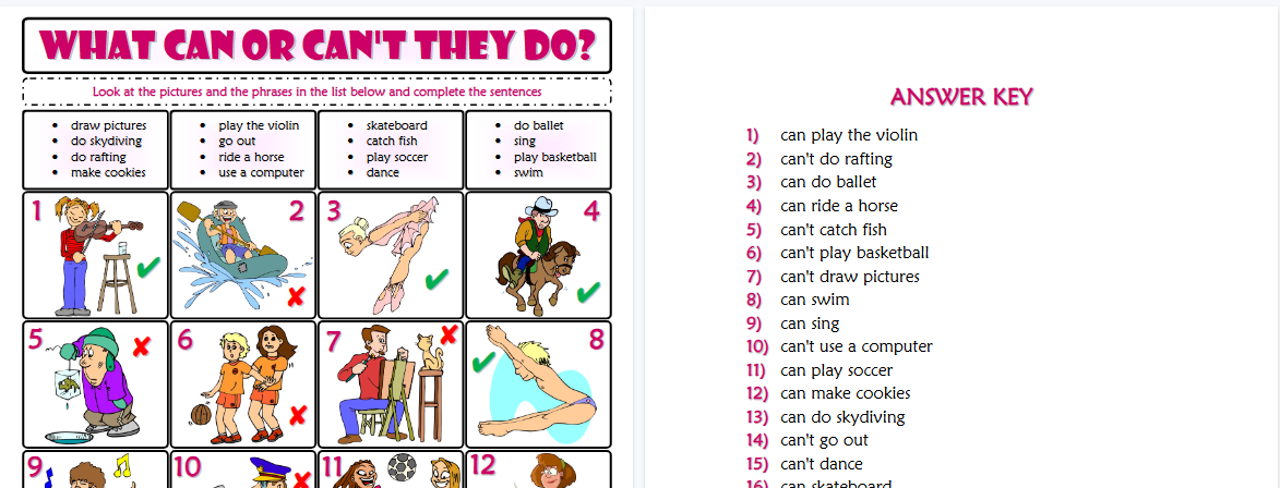 | 【2页完整高清可打印】Expressing Ability and Inability ESL Grammar Quiz for Kids(附答案) | |
