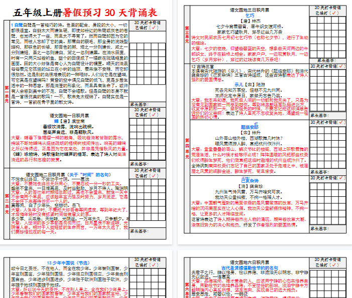 | 一键保存全6页PDF!五年级上册语文30天高效背诵计划表,每日打卡提分神器,免费极速下载助你轻松拿下古诗文满分! | |