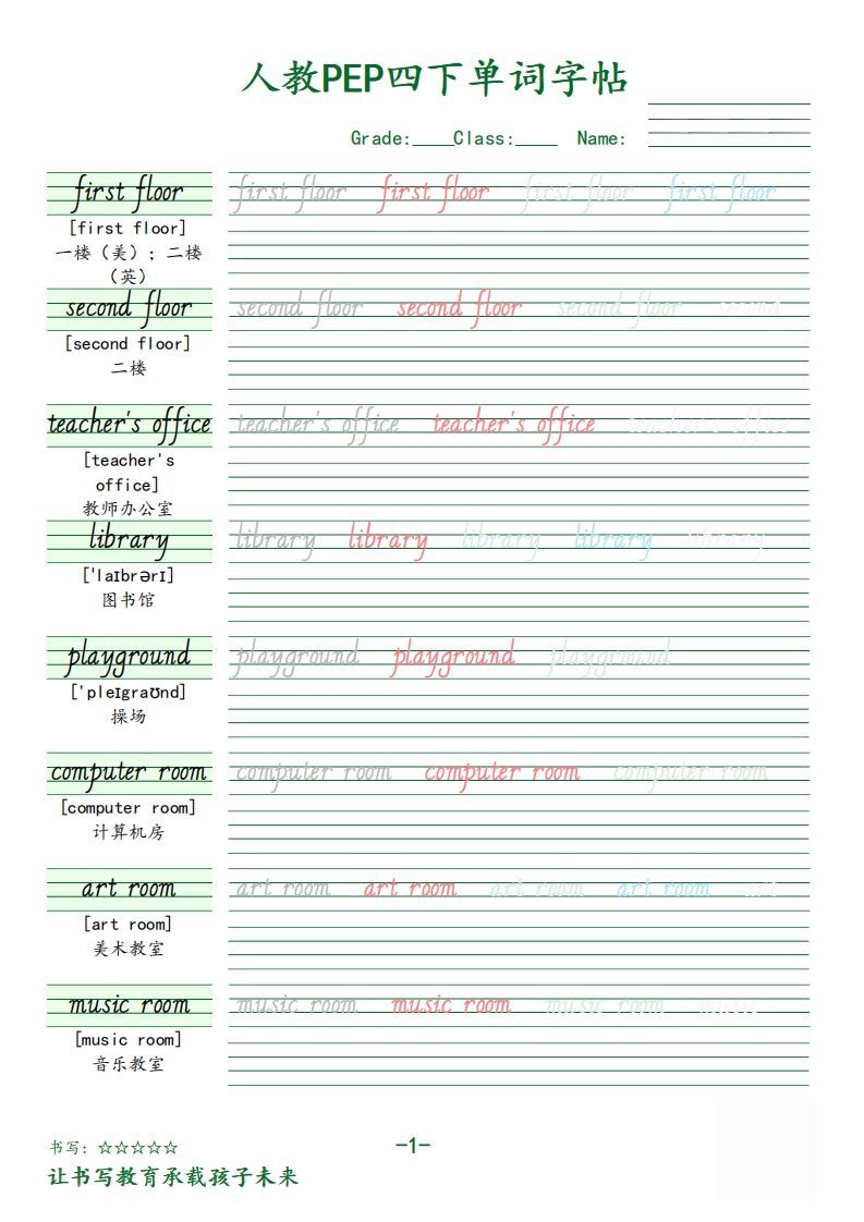 (人教PEP)四下英语单词字帖 – 同步教材,高清可打印 | |