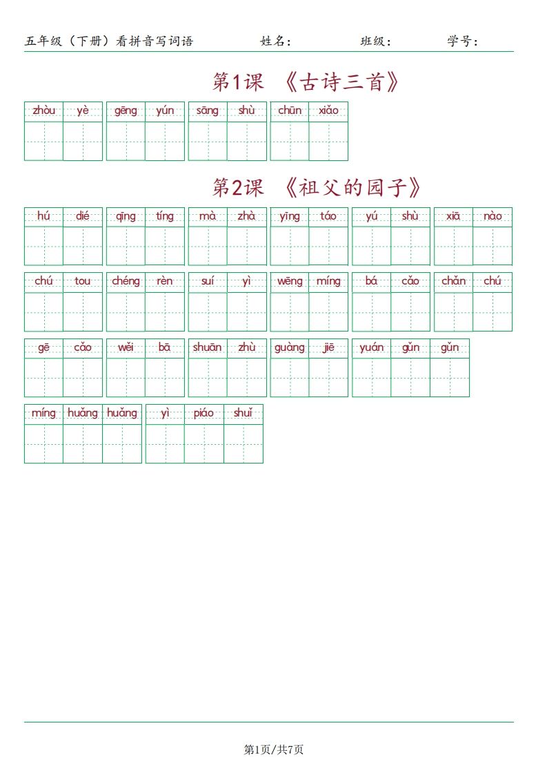 资源亮点 | ✅ 部编版五年级下册全6个单元看拼音写词语练习 ✅ 高清排版,标准田字格格式,扫码即打印 ✅ 每课含拼音+生字+词语+句子四步训练 ✅ 配套参考答案,错题记录更方便! |
